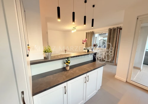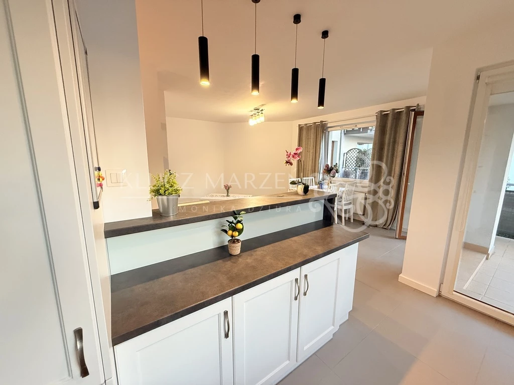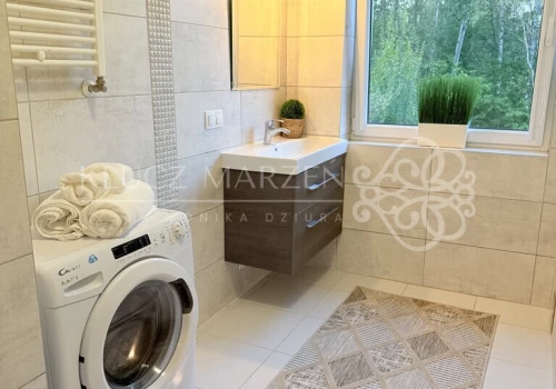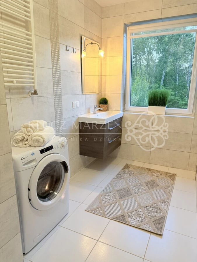 - kuchnia w pełni wyposażona w AGD – zmywarka, piekarnik, okap, płyta – gotowa na Twoje kulinarne pomysły,